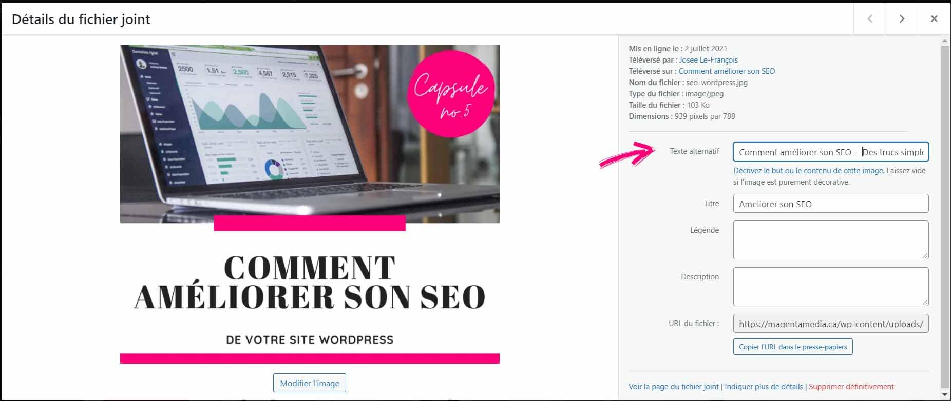 Ces descriptions influencent votre référencement et indiquent aux robots ce que chacune des images représente.